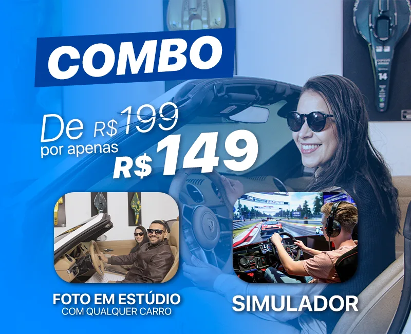 Combos exclusivos de passeios com supercarros, simuladores e ensaios fotográficos para você realizar o seu momento de piloto com adrenalina, estilo e zero burocracia.